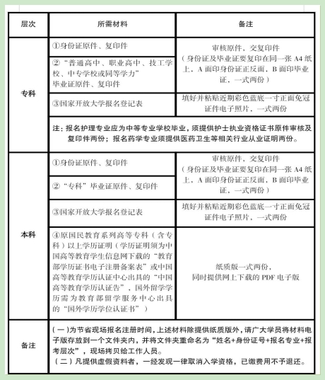 【查驗(yàn)證件】——【填寫國家開放大學(xué)報(bào)名登記表(也可提前自行下載打印電子版填好)】——【在“國家開放大學(xué)統(tǒng)一身份認(rèn)證平臺”錄入報(bào)名信息】——【打印報(bào)名信息表后本人核對簽字確認(rèn)】——【掃碼采集新生照片】——【在線繳費(fèi)(具體學(xué)費(fèi)以山東開放大學(xué)開放教育在線繳費(fèi)平臺為準(zhǔn),屆時(shí)如繳費(fèi)系統(tǒng)不開放,繳費(fèi)事宜則另行通知)】——【掃碼加入新生微信群】